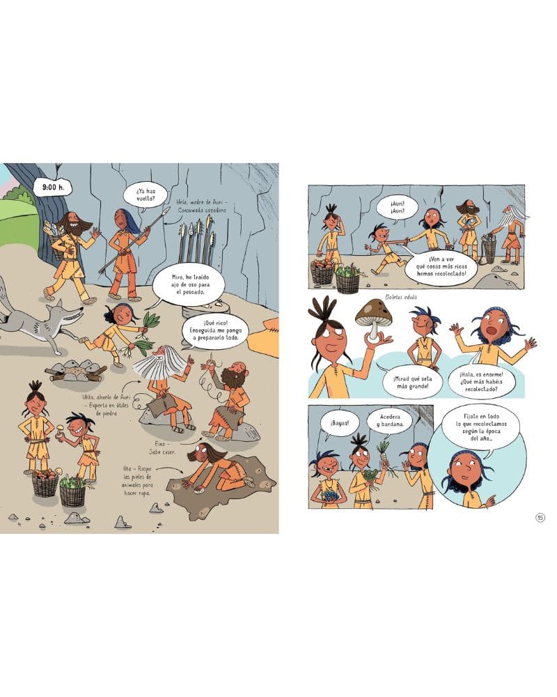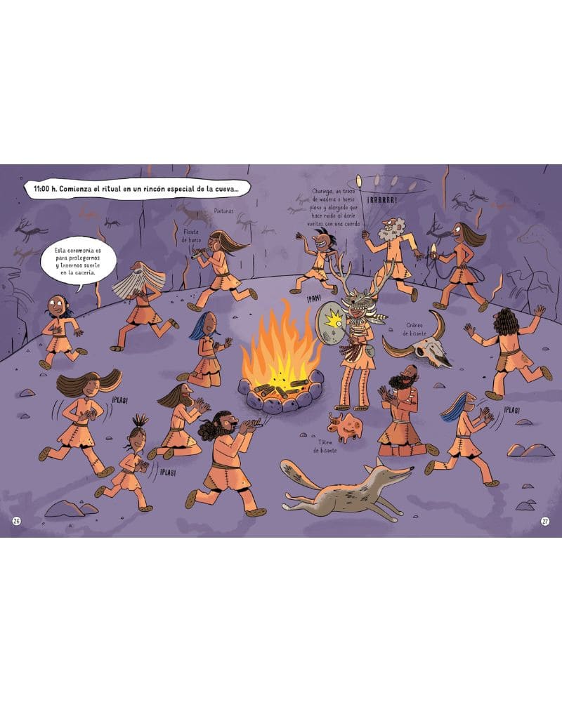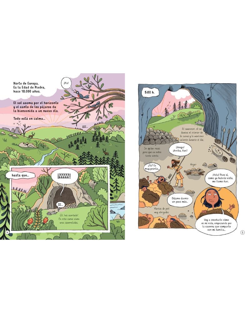 24 horas en la Edad de Piedra es un libro en formato cómic que invita a descubrir cómo era la vida cotidiana en la Prehistoria de una manera amena, visual y fácil de entender. A lo largo de la historia, acompañamos a un cavernícola durante un día completo para conocer dónde vive, cómo caza, qué come y de qué manera fabrica sus herramientas de piedra.