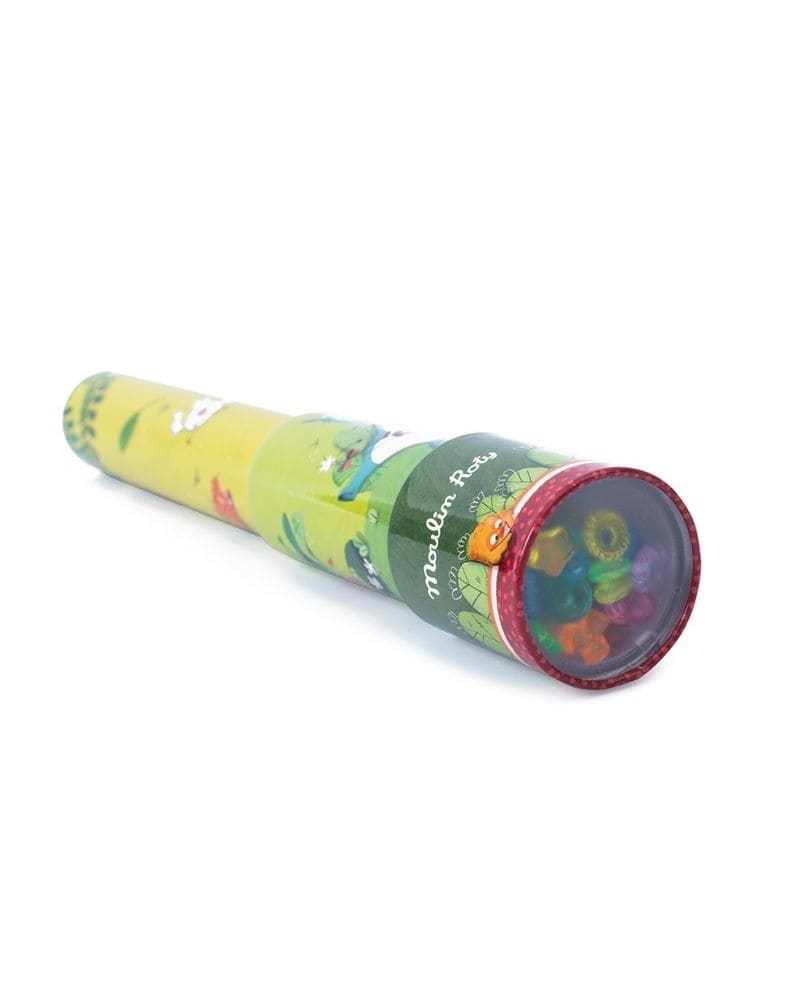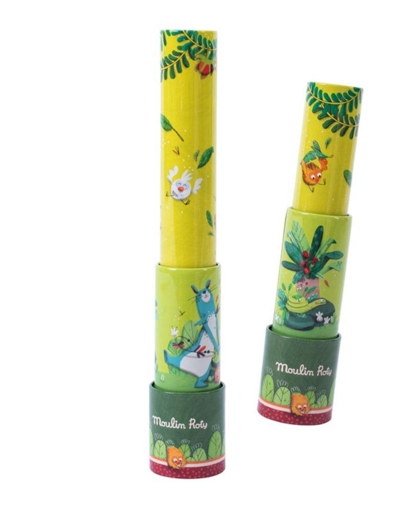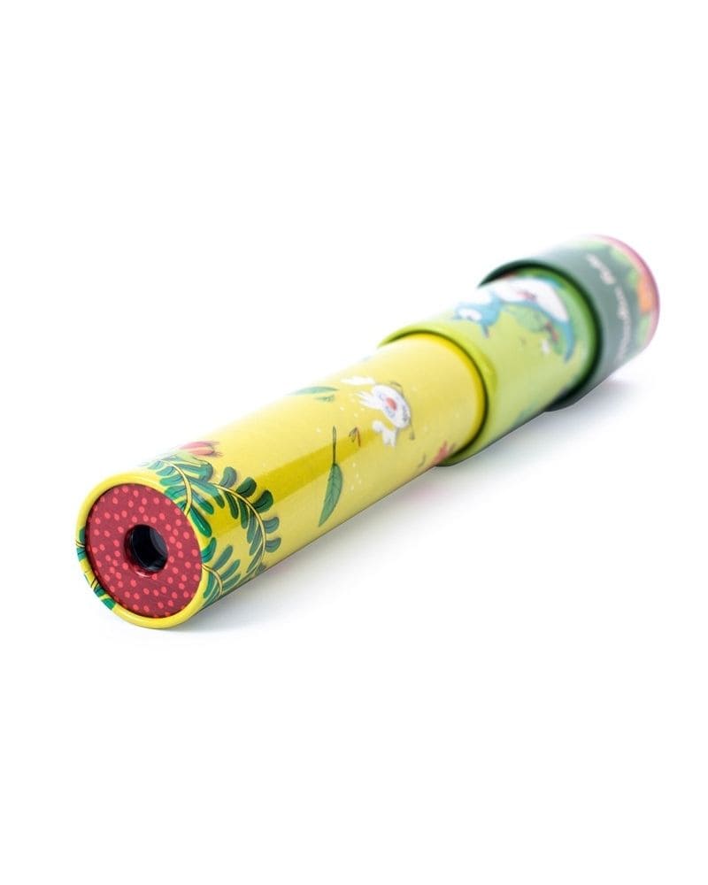 Caleidoscopio de metal colorido con ilustraciones inspiradas en el universo de la selva. Diseñado para ofrecer horas de entretenimiento visual, permite girar simultáneamente y en sentidos opuestos sus dos partes, creando múltiples combinaciones de colores y formas que fascinan a niños y adultos. Un juguete clásico que estimula la curiosidad, la percepción visual y la imaginación.