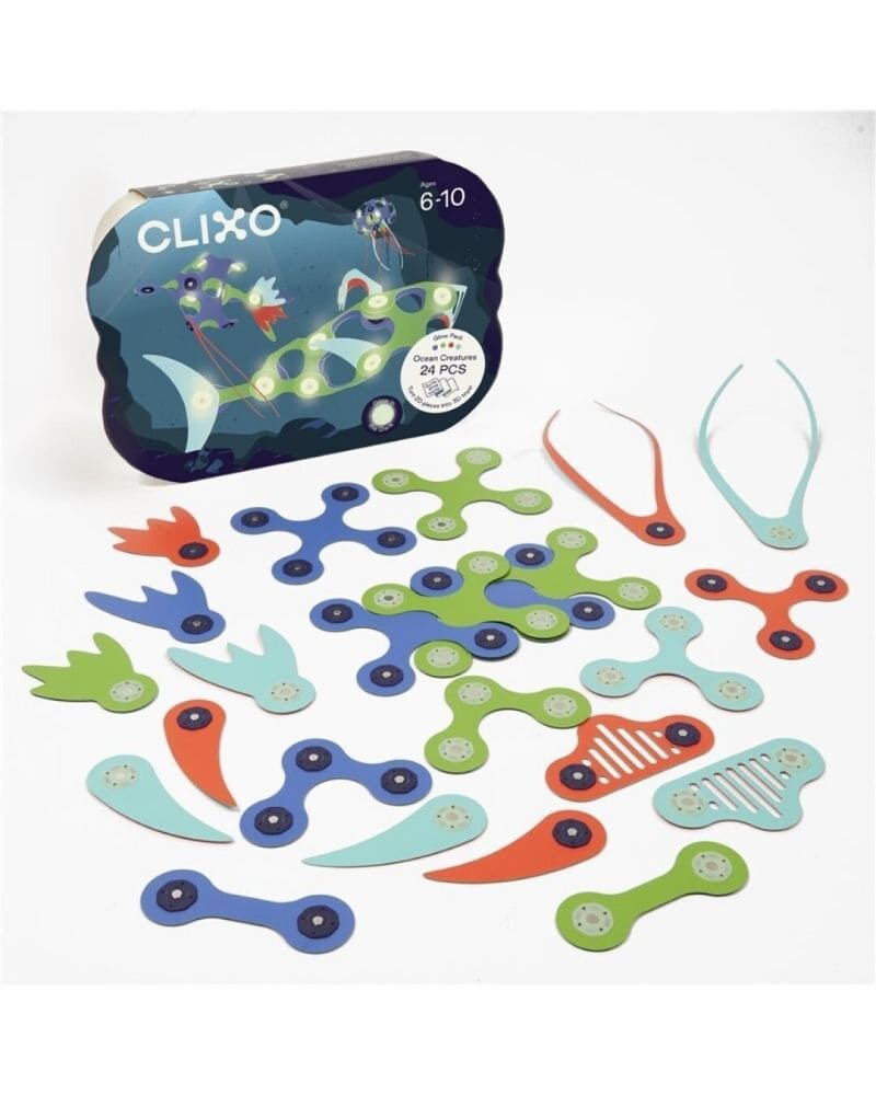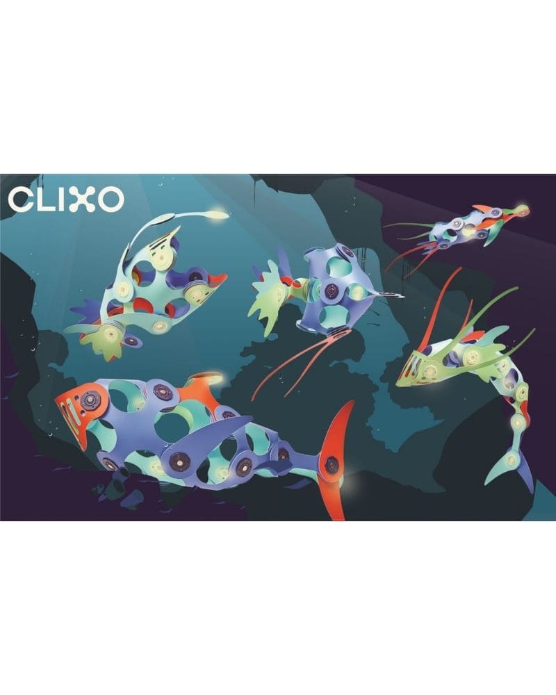 El pack Ocean Creatures contiene piezas nuevas y especiales. Aletas y tentáculos de CLIXO que brillan en la oscuridad dan vida a las maravillas submarinas. Lleva la inspiración creativa a lo más profundo, fomenta el aprendizaje STEAM y crea infinitas criaturas submarinas. El pack contiene 24 piezas en 9 formas únicas de CLIXO.