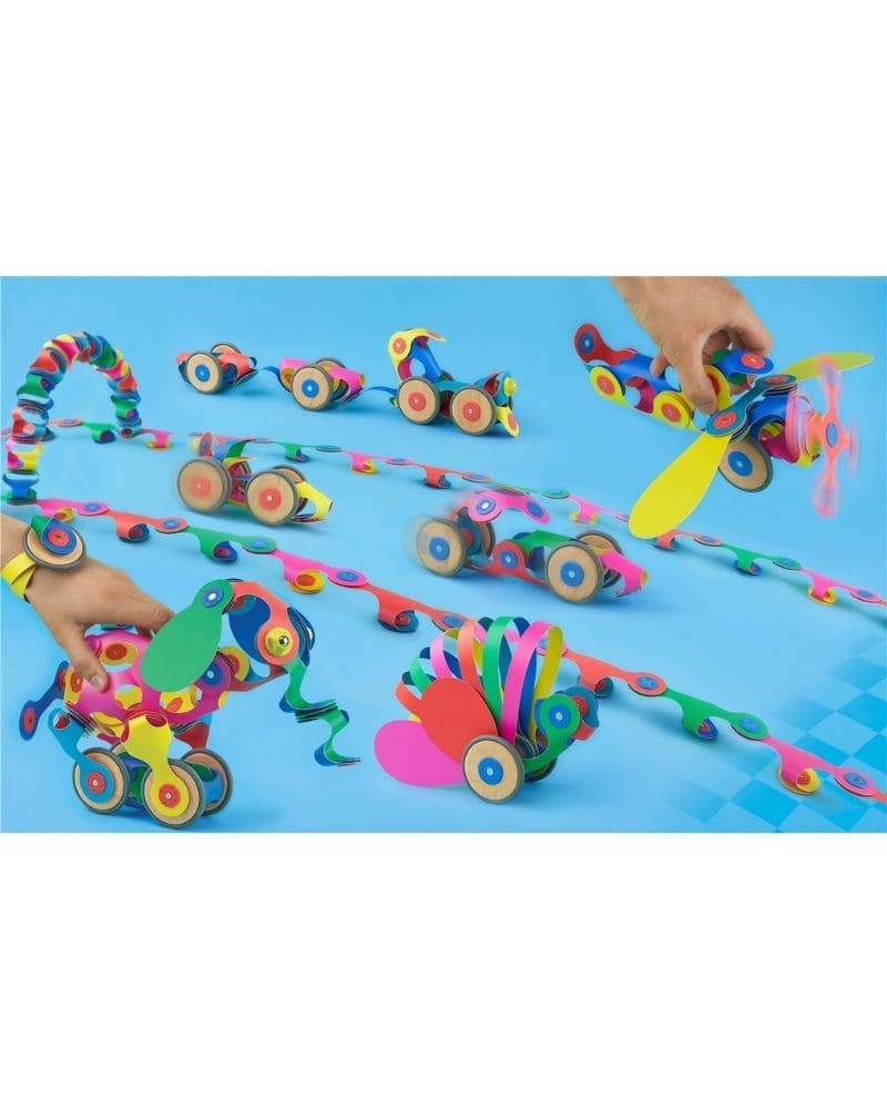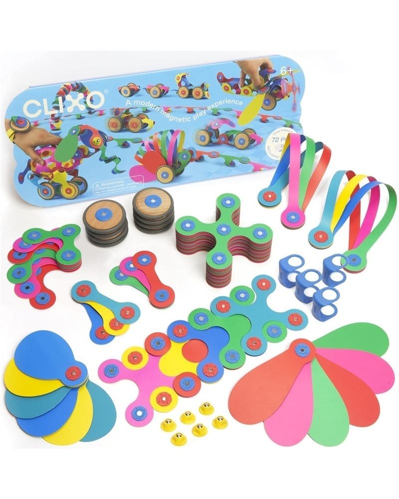 Con ruedas, ejes y conectores especiales, los niños pueden construir desde coches y camiones hasta robots y criaturas rodantes, desarrollando creatividad, motricidad fina y habilidades STEAM. Cada pieza se une fácilmente gracias al sistema magnético Clixo, fomentando la imaginación libre y el pensamiento espacial.