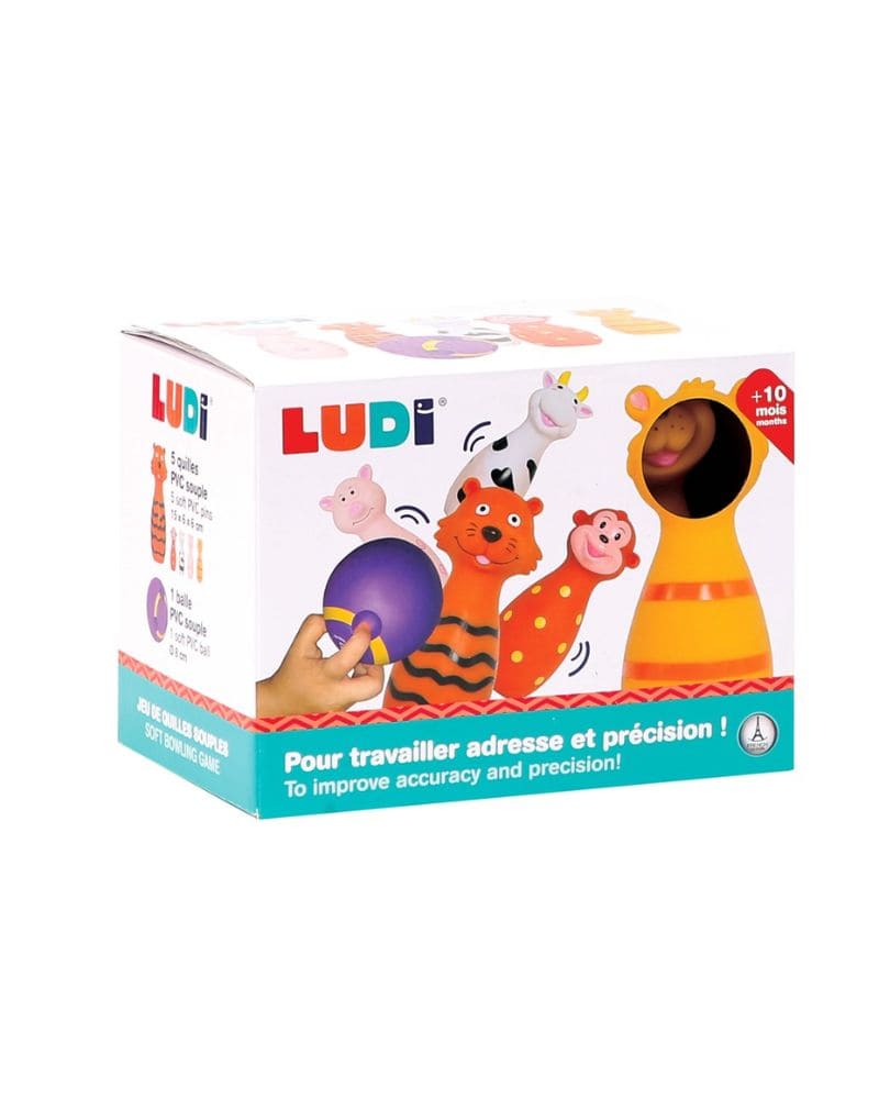 ¡Un divertido y tranquilo juego de bolos para los más pequeños! Perfecto para niños a partir de 10 meses, este juego presenta cinco bolos con forma de animales, como gato, vaca, cerdo, mono y perro, y una pelota especialmente diseñada para sus manos. ¡Ideal para momentos de risa y aprendizaje mientras desarrollan sus habilidades motoras!