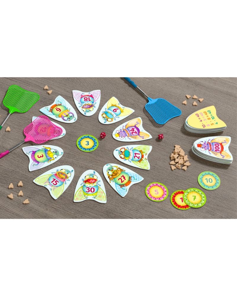 Cada jugador lanza los dados y busca el resultado correcto en las tarjetas o el tablero. Solo el jugador que atrape primero la mosca correcta con su matamoscas gana la ronda. La partida continúa hasta completar todas las multiplicaciones, fomentando la rapidez y la concentración.