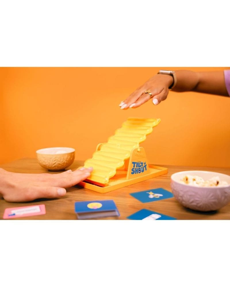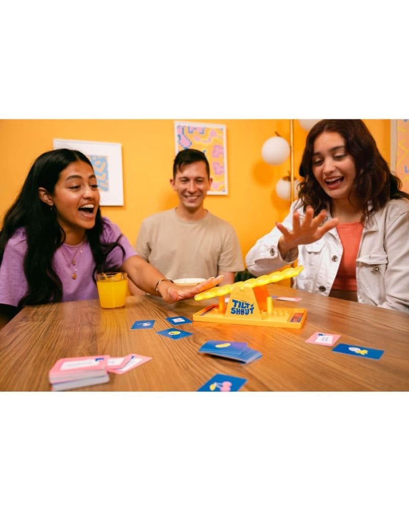 Tilt’N’Shout es el juego de mesa perfecto para quienes disfrutan de los retos rápidos y llenos de tensión. Como en un concurso televisivo, los equipos deben responder categorías antes de que la bolita llegue al final del balancín. ¡Risas, adrenalina y competición aseguradas! Cada ronda se vuelve más complicada, poniendo a prueba vuestros reflejos mentales y vuestra rapidez al pensar bajo presión.
