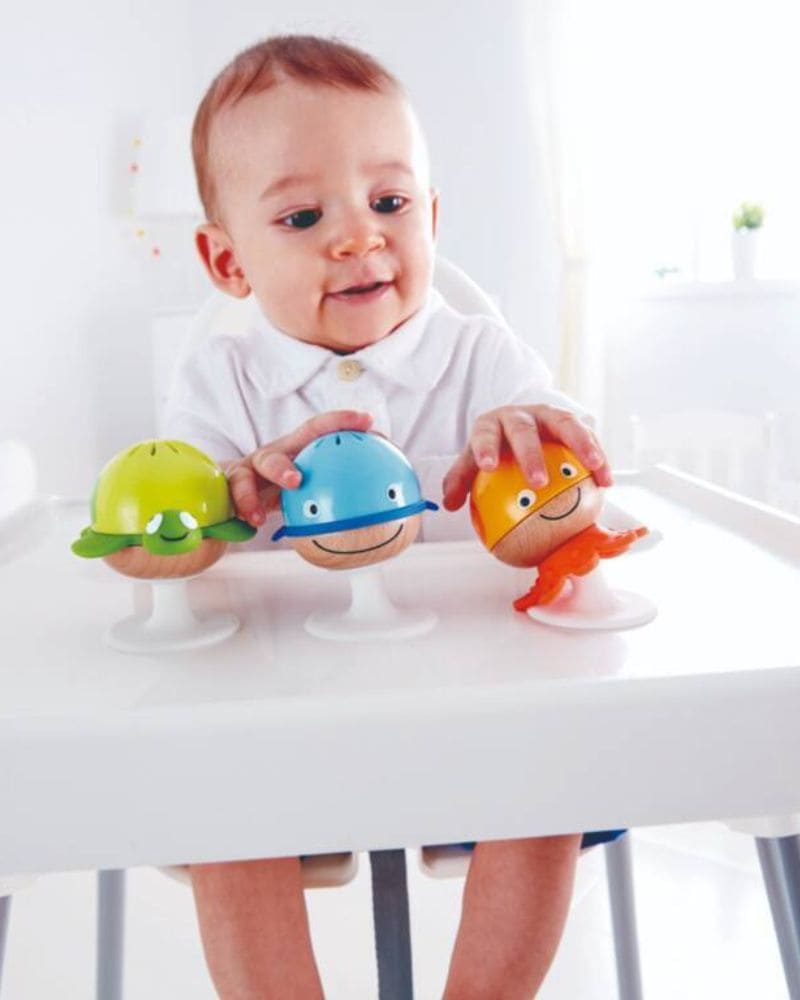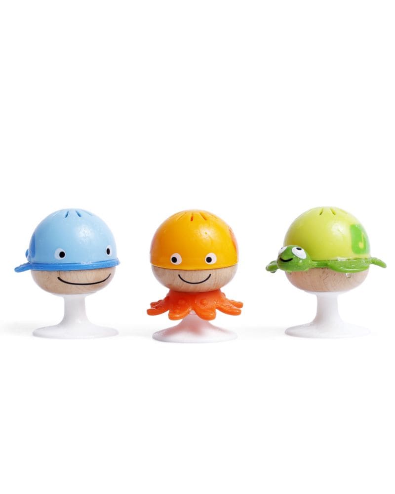 Este juego de sonajeros permite a los más pequeños explorar sonidos y movimientos mientras juegan en cualquier lugar. Incluye tres adorables animales acuáticos: un pulpo, una ballena y una tortuga, cada uno con un sonido único al agitarlo. Gracias a sus ventosas, los sonajeros se pueden adherir a superficies lisas como mesas, bandejas de trona o ventanas, haciendo que la diversión sea segura y portátil.