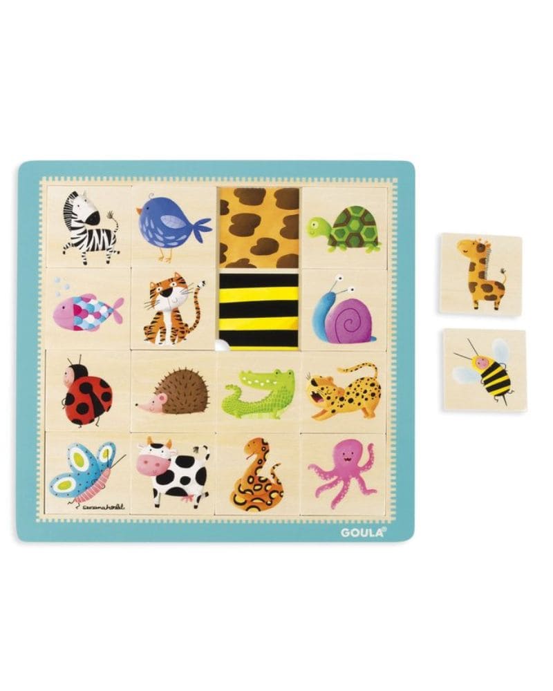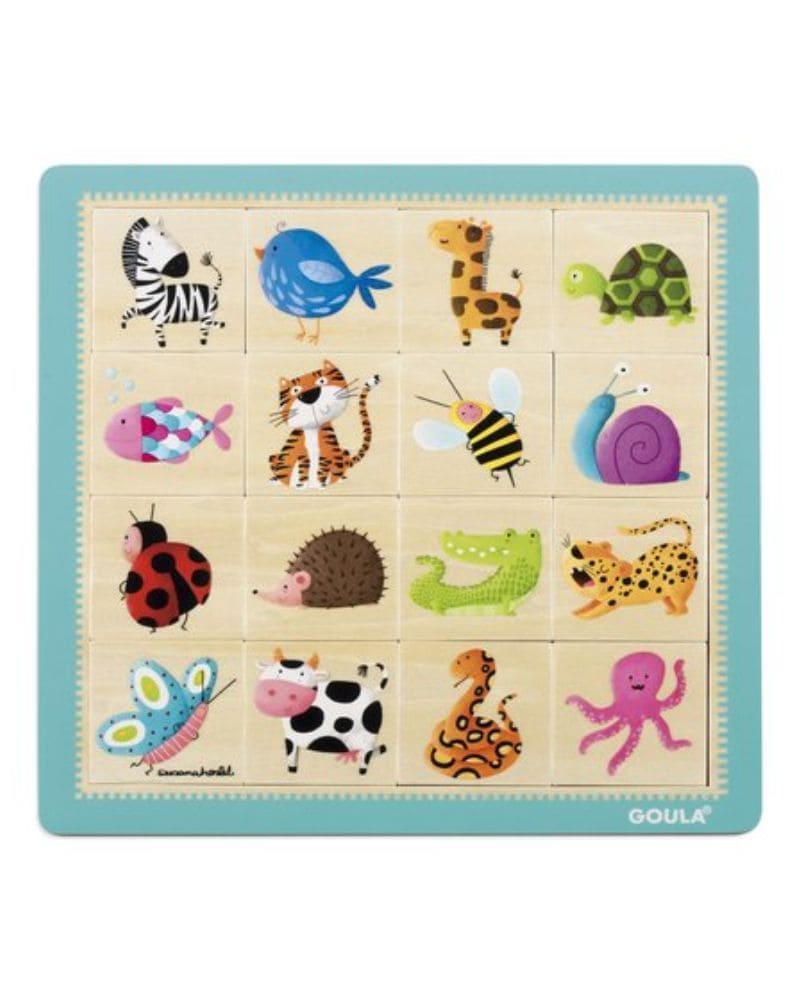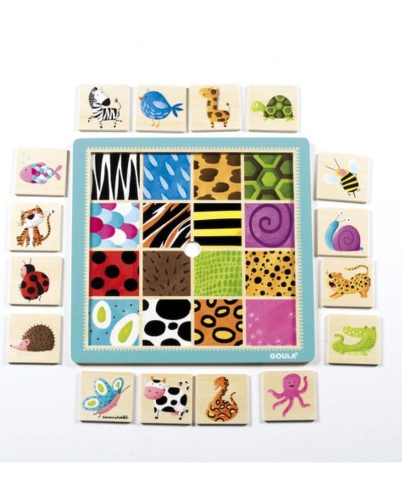 Puzle de 16 piezas de madera ilustrado con diferentes animalitos: cebra, pájaro, jirafa, tortuga, pez, tigre, abeja, caracol, mariquita, erizo, cocodrilo, leopardo, mariposa, vaca, serpiente y pulpo. Los niños pueden encajar las distintas figuras guiándose por el dibujito que aparece en el interior, este es una pista con un dibujo en el que se reproduce la piel del animalito que hay que encajar para hacer más sencillo el emparejamiento. El puzle no tiene pivotes para que al niño le sea un poco más difícil el agarre.