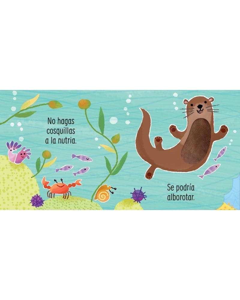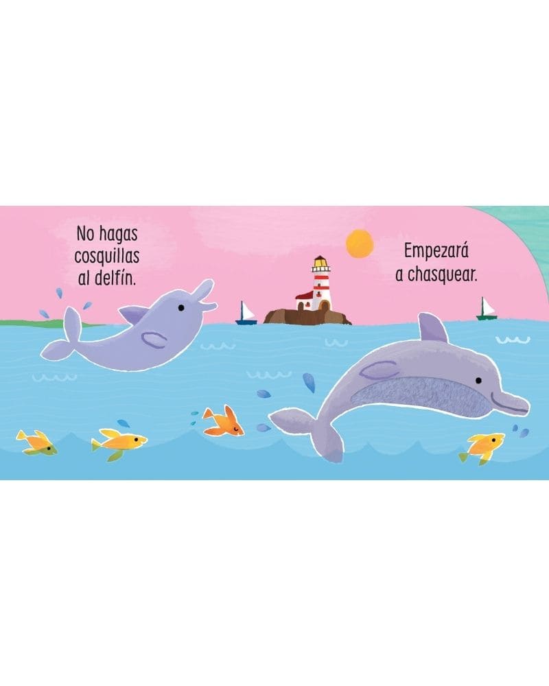 Texturas suaves y sonidos divertidos: Al acariciar las texturas integradas en cada página, los niños activan sonidos auténticos de los animales marinos, incluyendo el delfín, la tortuga, el pelícano y la nutria marina.