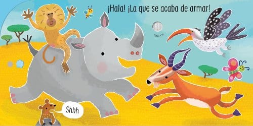 - Texturas y sonidos: Al tocar las áreas especiales de cada página, los niños descubrirán sonidos auténticos como el gruñido del rinoceronte, las risas del babuino, el brinco de la gacela y el graznido del toco.