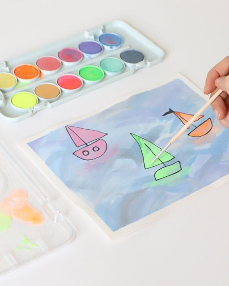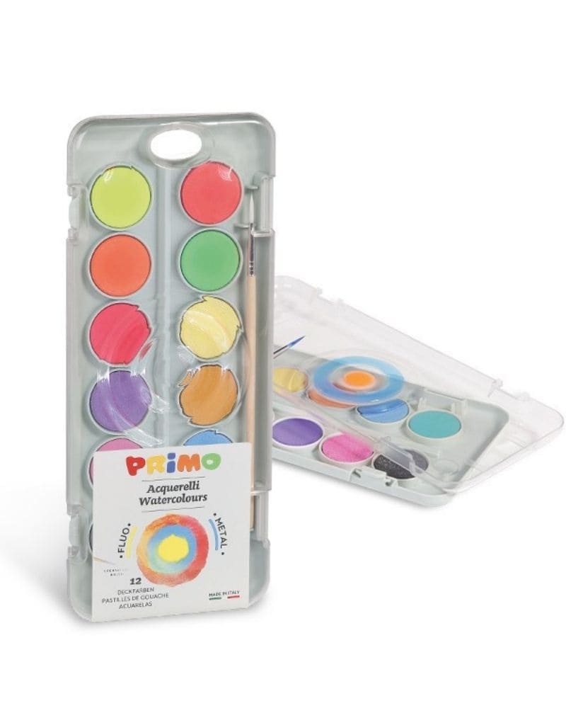 La caja con tapa dispone de 12 pastillas de acuarela de diferentes colores metalizados y flúor, así como un pincel.