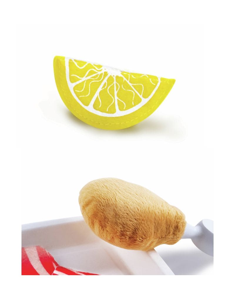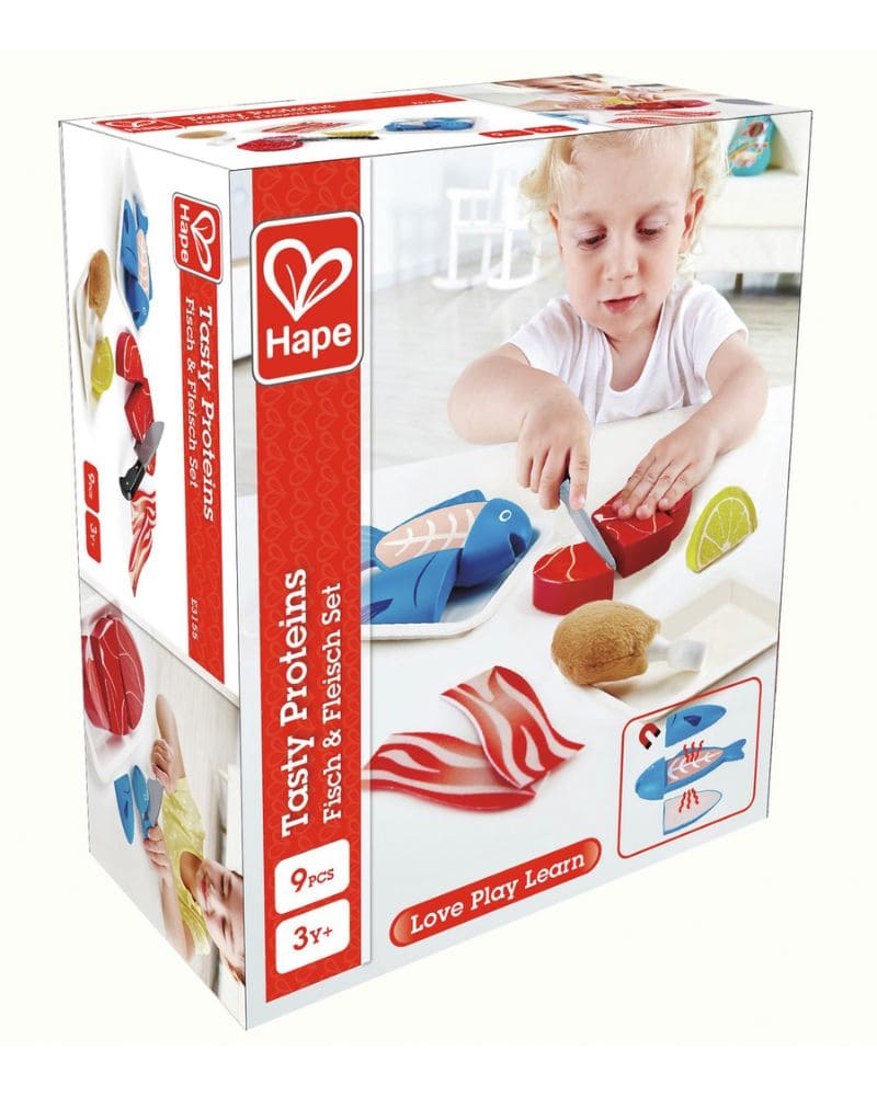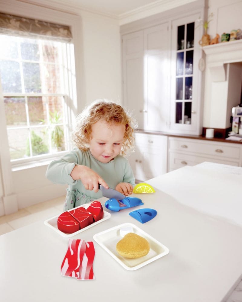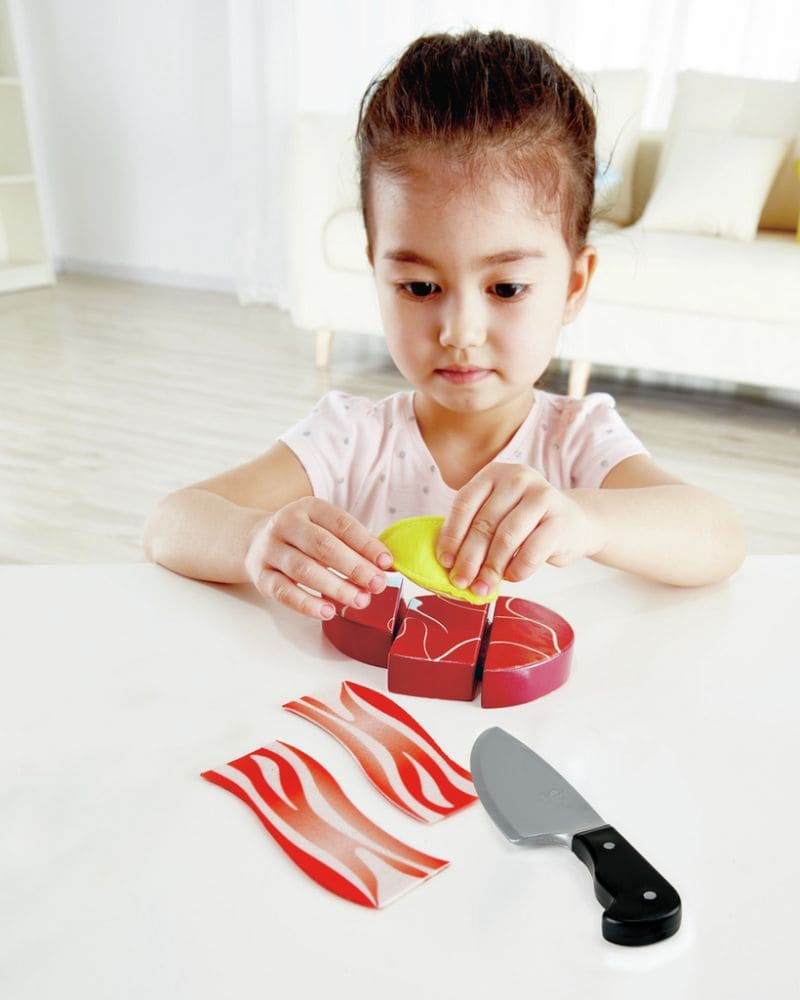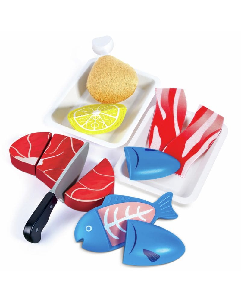 Este set permite a los niños practicar la preparación de alimentos proteicos de forma segura y divertida. Incluye ingredientes realistas de carne de vacuno, pollo, pescado y panceta, además de un trozo de limón y un cuchillo de juguete. Cada pieza se separa en bandejas y componentes para ofrecer mayor realismo, fomentando el juego simbólico y de imitación en la cocina.