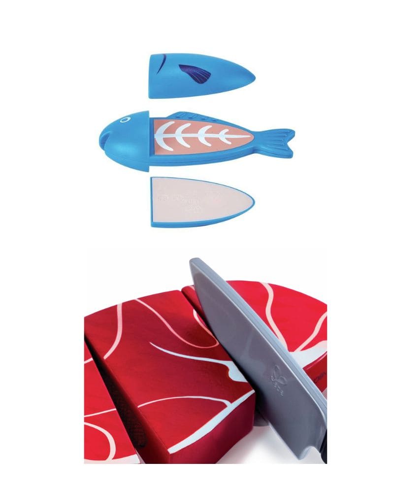 Estimula la motricidad fina y la coordinación al manipular los ingredientes y el cuchillo de juguete.