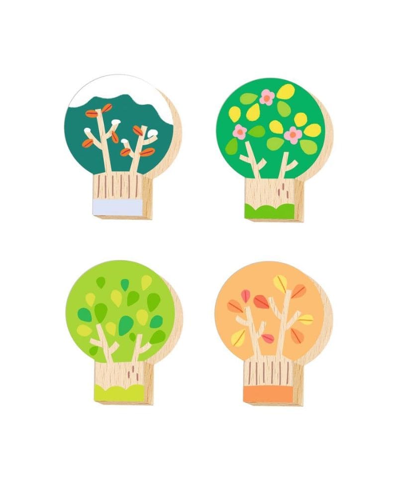 Un rompecabezas XXL de las cuatro estaciones con piezas grandes y elementos de madera para colocar sobre la escena. Incluye ilustraciones para buscar dentro del puzzle, fomentando la observación, la motricidad fina y el descubrimiento de los cambios de la naturaleza a lo largo del año.