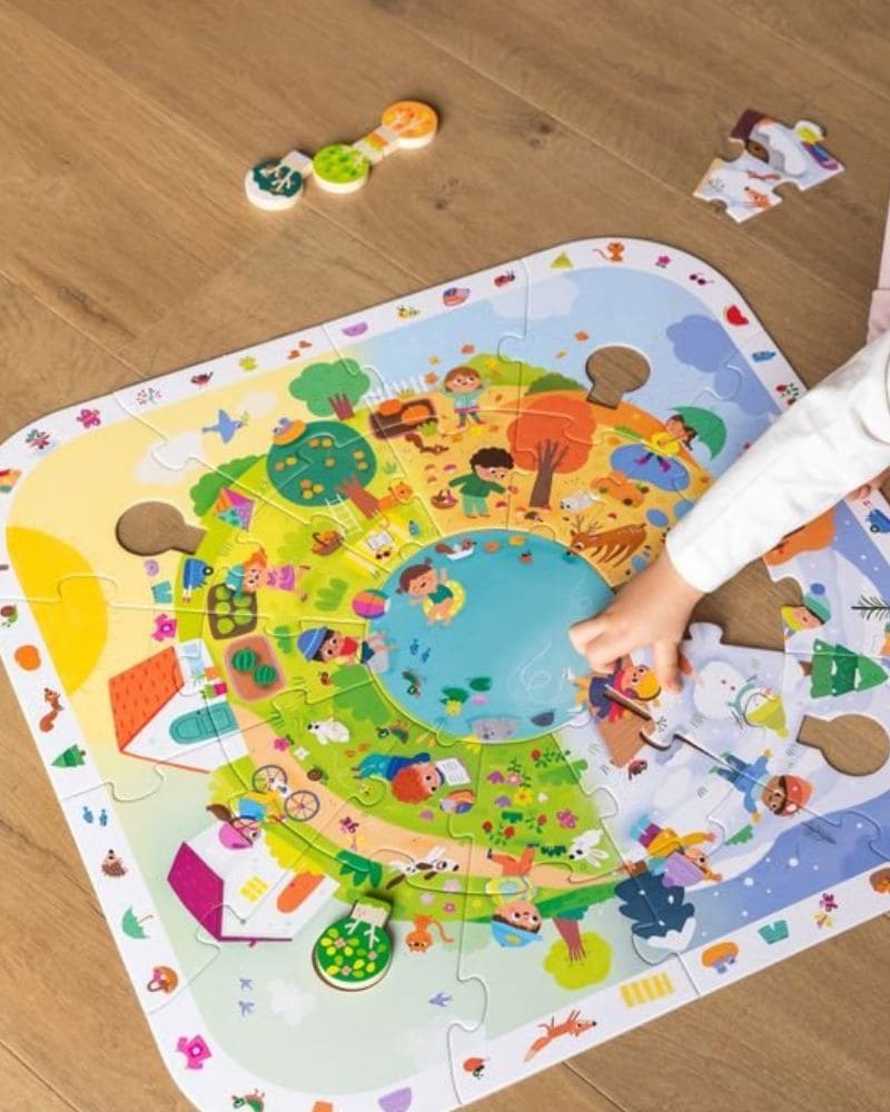 Este rompecabezas XXL de las cuatro estaciones está diseñado para que los niños descubran la naturaleza y sus cambios de forma divertida. Sus piezas grandes y coloridas son fáciles de manipular, favoreciendo la autonomía y el desarrollo de la motricidad fina.