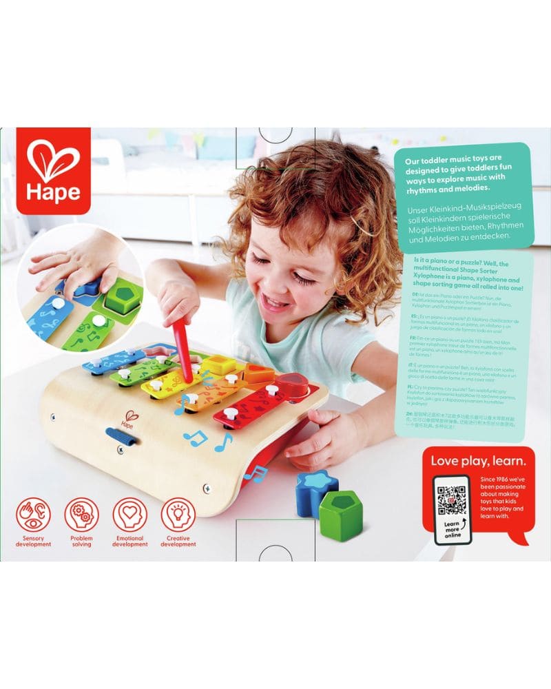 Este juguete multifuncional combina música y aprendizaje de formas y colores. Funciona como xilófono, piano y rompecabezas al mismo tiempo. Incluye cinco piezas de puzzle de madera, una baqueta y una base de xilófono/piano. Los niños pueden colocar las piezas en los orificios correspondientes, clasificarlas por formas o colores, o golpear las piezas con la baqueta para tocar la melodía Do, Re, Mi, Fa, Sol. Su diseño tres en uno permite múltiples formas de juego y desarrollo sensorial.